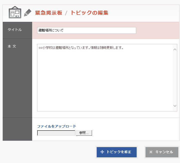 緊急掲示板のトピック編集画面の操作について説明します。