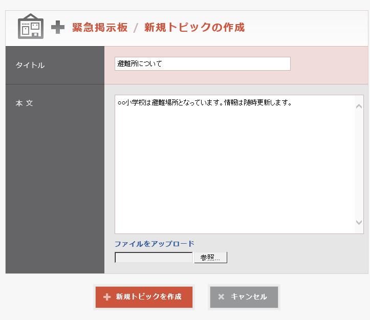 | 5 | 「キャンセル」ボタンを押すと入力内容が破棄されます。トピックは作成されません。 |