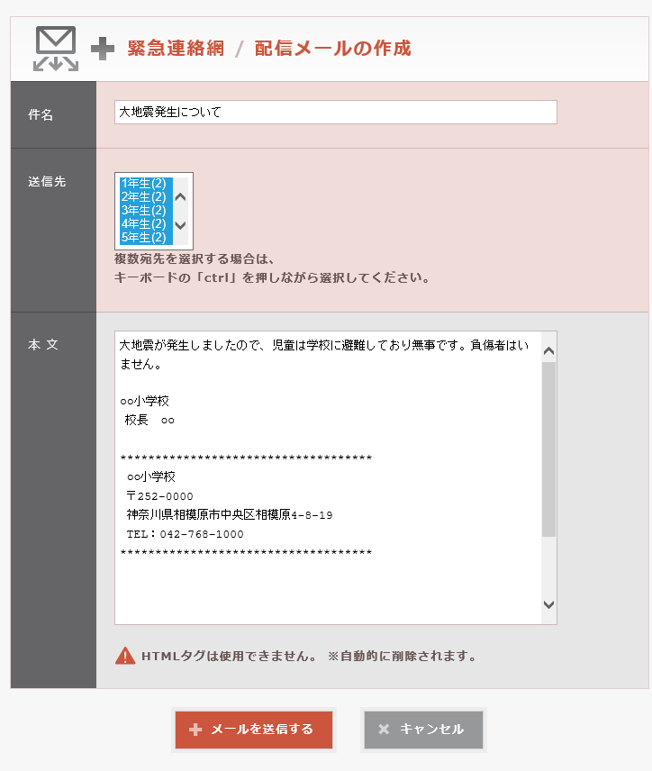 | 4 | タイトル、配信するグループの選択、本文の記入を終えたら、「メールを送信する」ボタンを押します。配信内容の確認画面が表示されます。 |